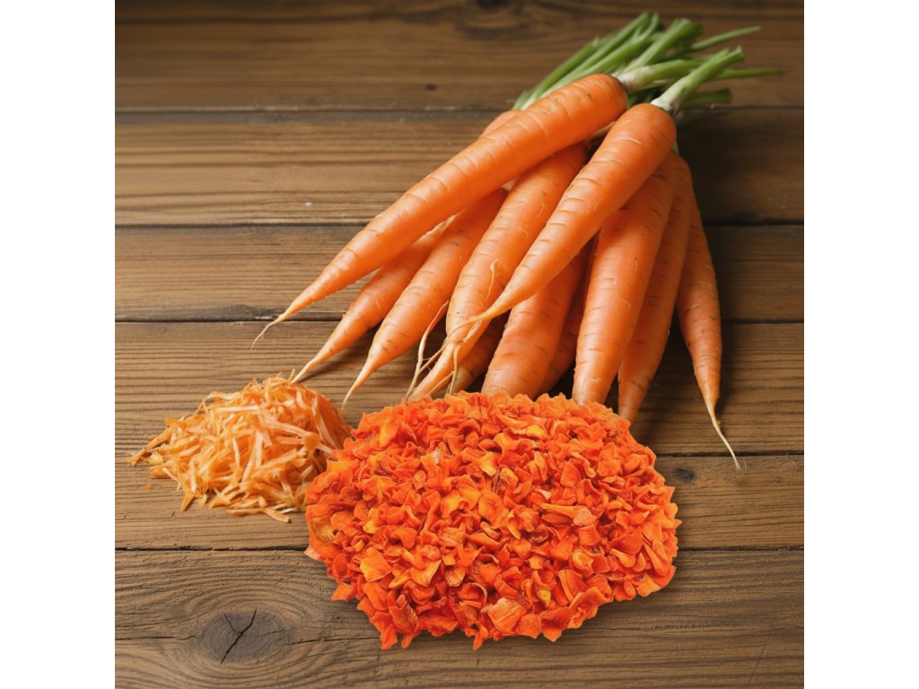 Sušená mrkev (karotka) je šetrně sušený přírodní krmný doplněk bohatý na karoteny, vybrané vitaminy a stopové prvky. Díky šetrnému sušení si zachovává cenné látky a je vhodná jako chutný doplněk krmné dávky i jako komponent do vlastních směsí (müsli).