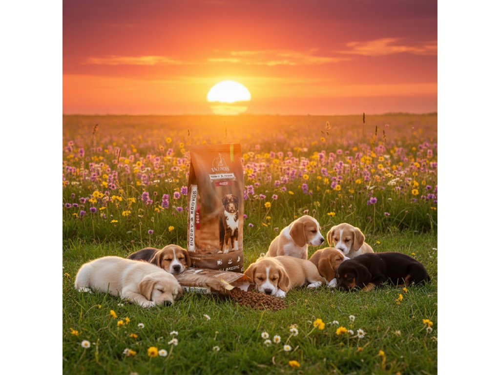 Prémiové kompletní krmivo bohaté na hovězí pro štěňata a mladé psy všech plemen.